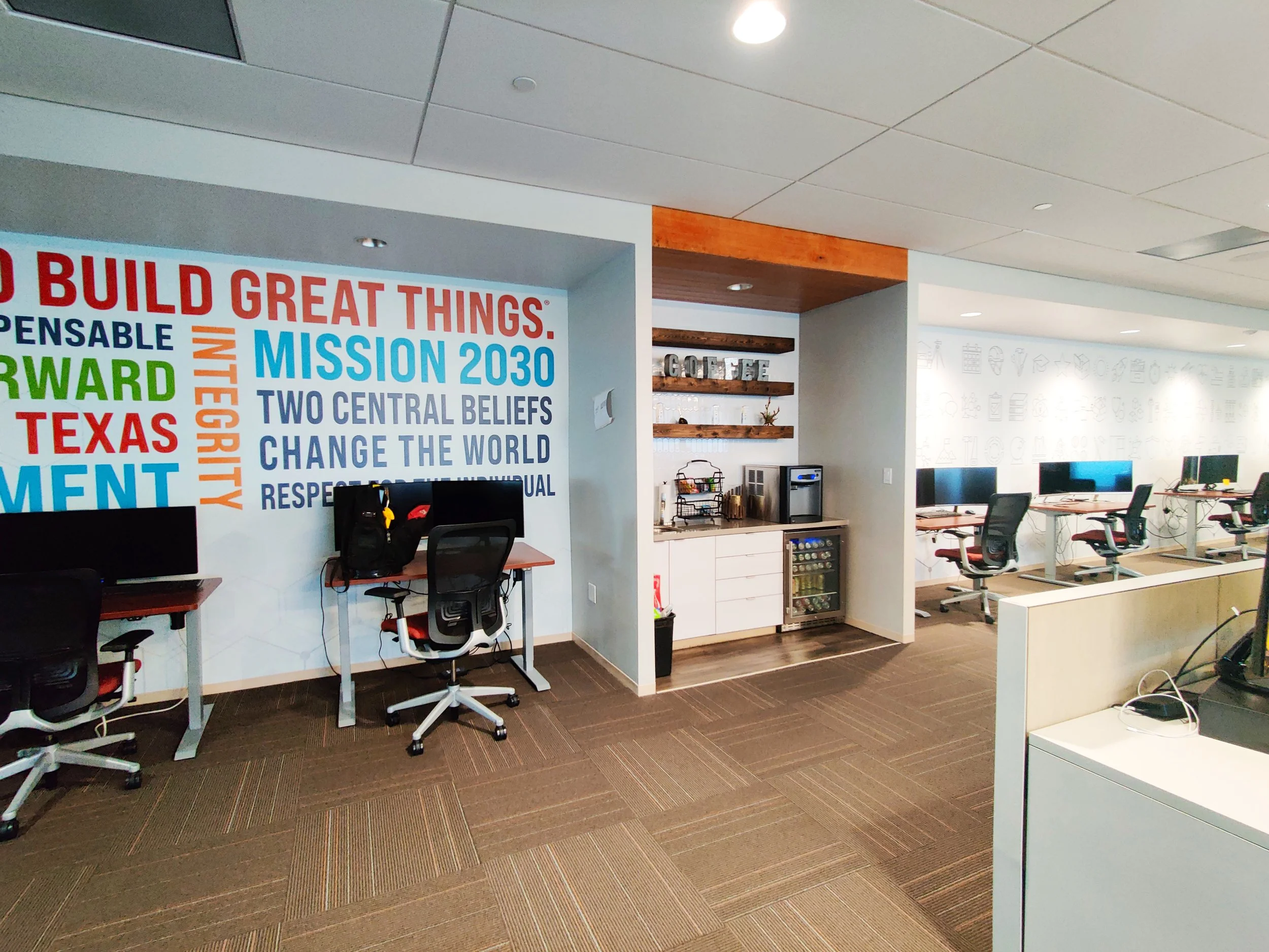 The DPR Construction Houston office features a custom art and graphics program designed to reflect the company’s mission, values, and energetic culture. Each piece was thoughtfully created to capture the spirit of Houston, incorporating local references and bold colors that mirror DPR’s dynamic brand identity.