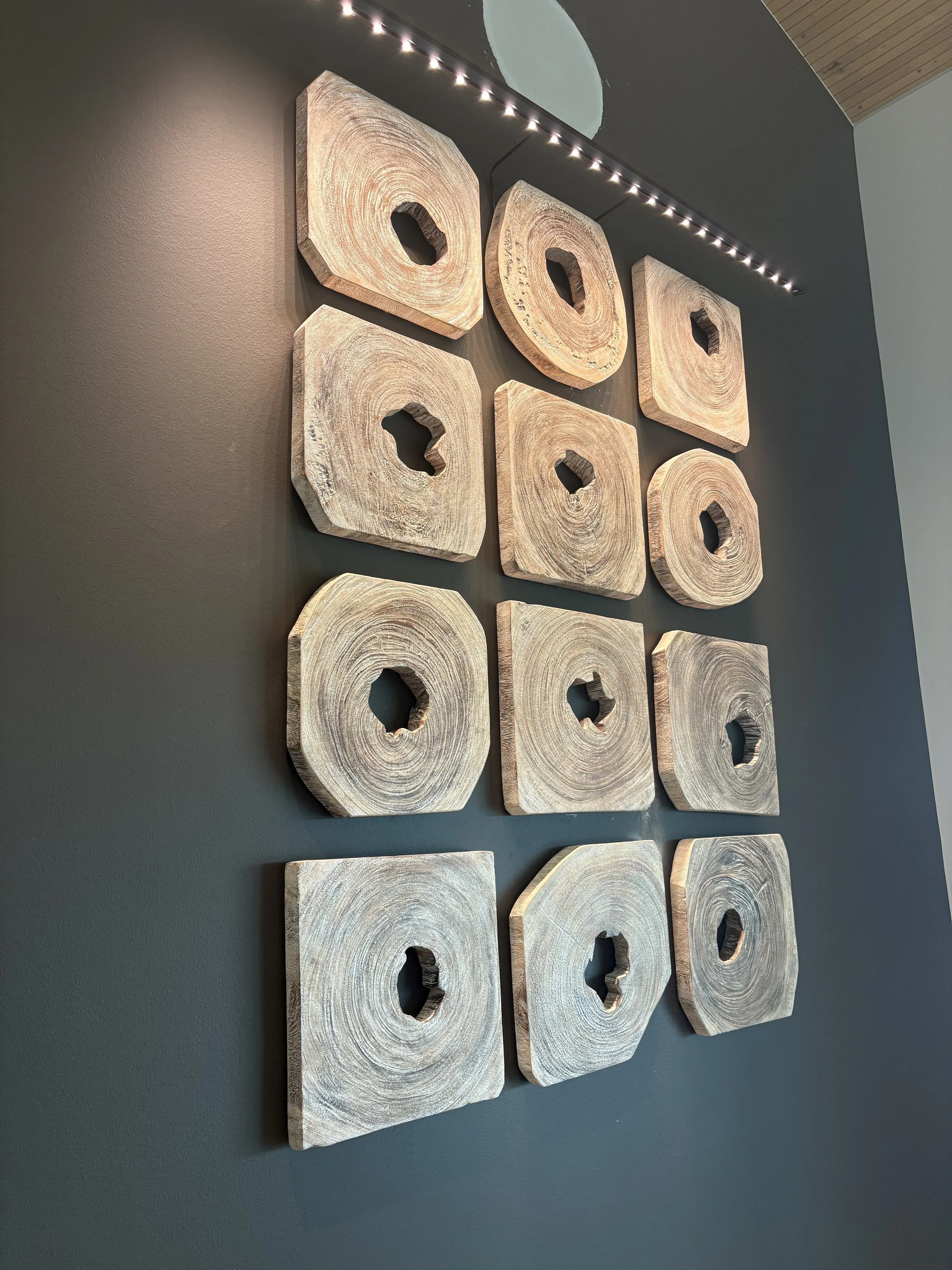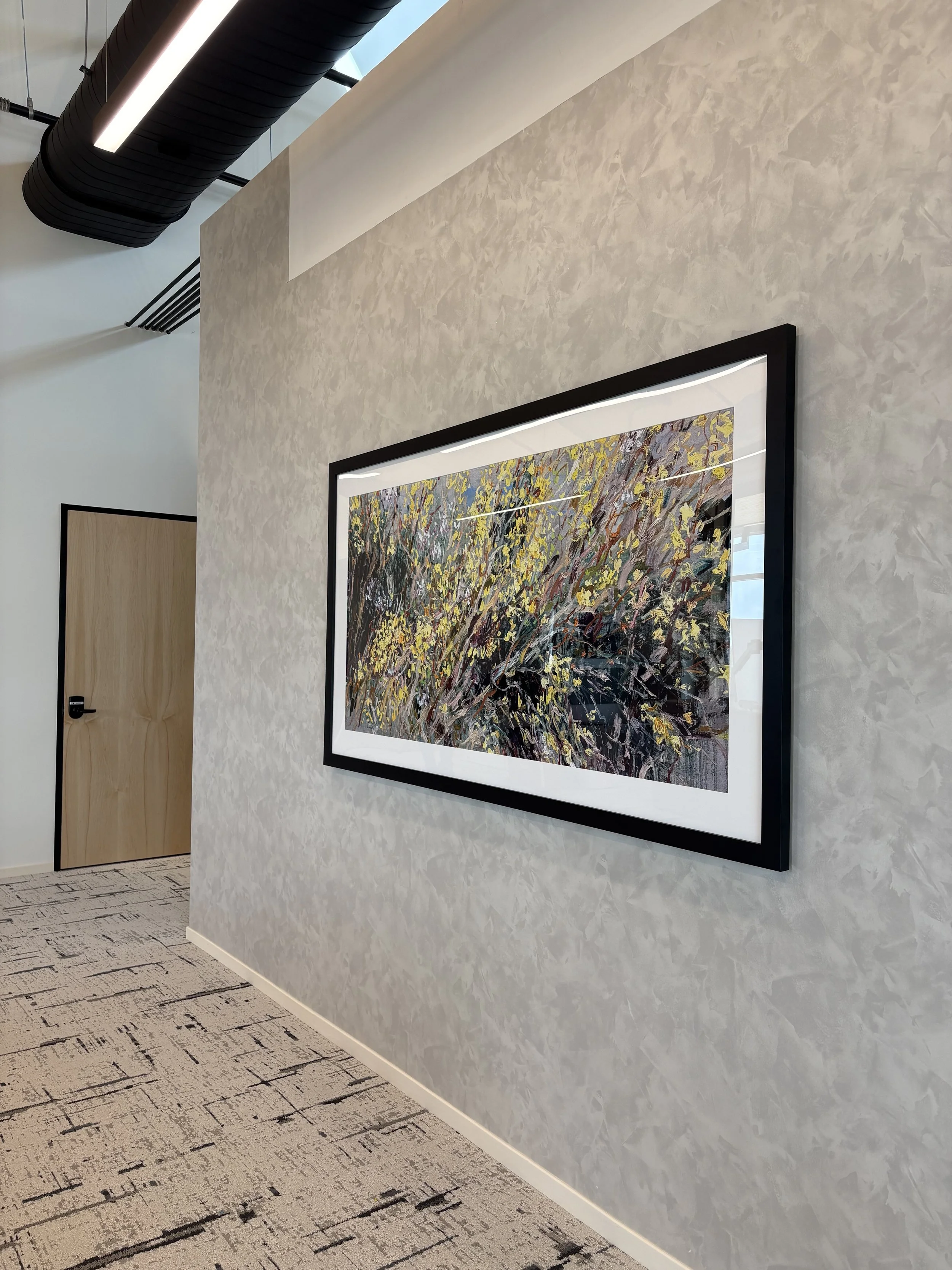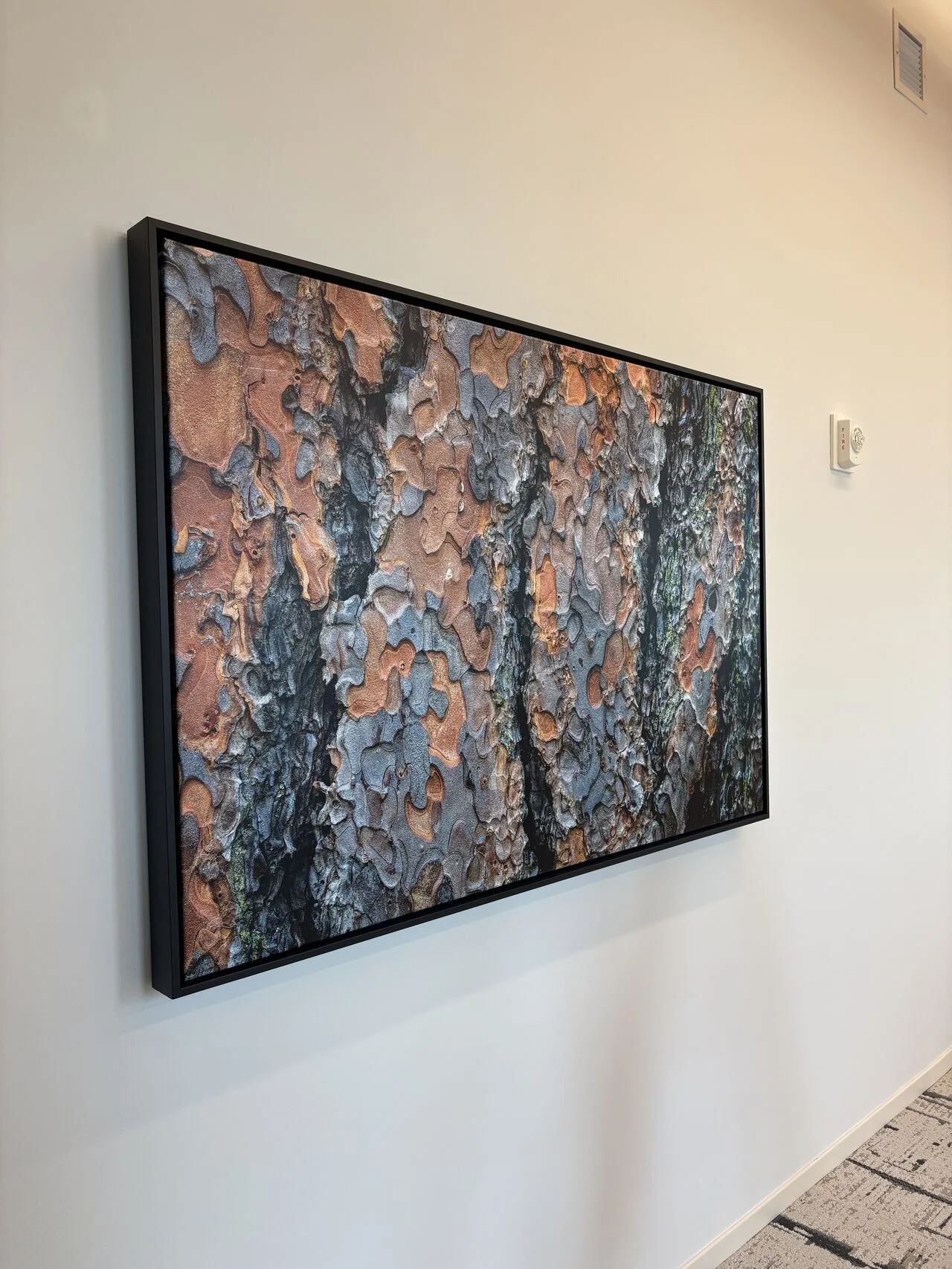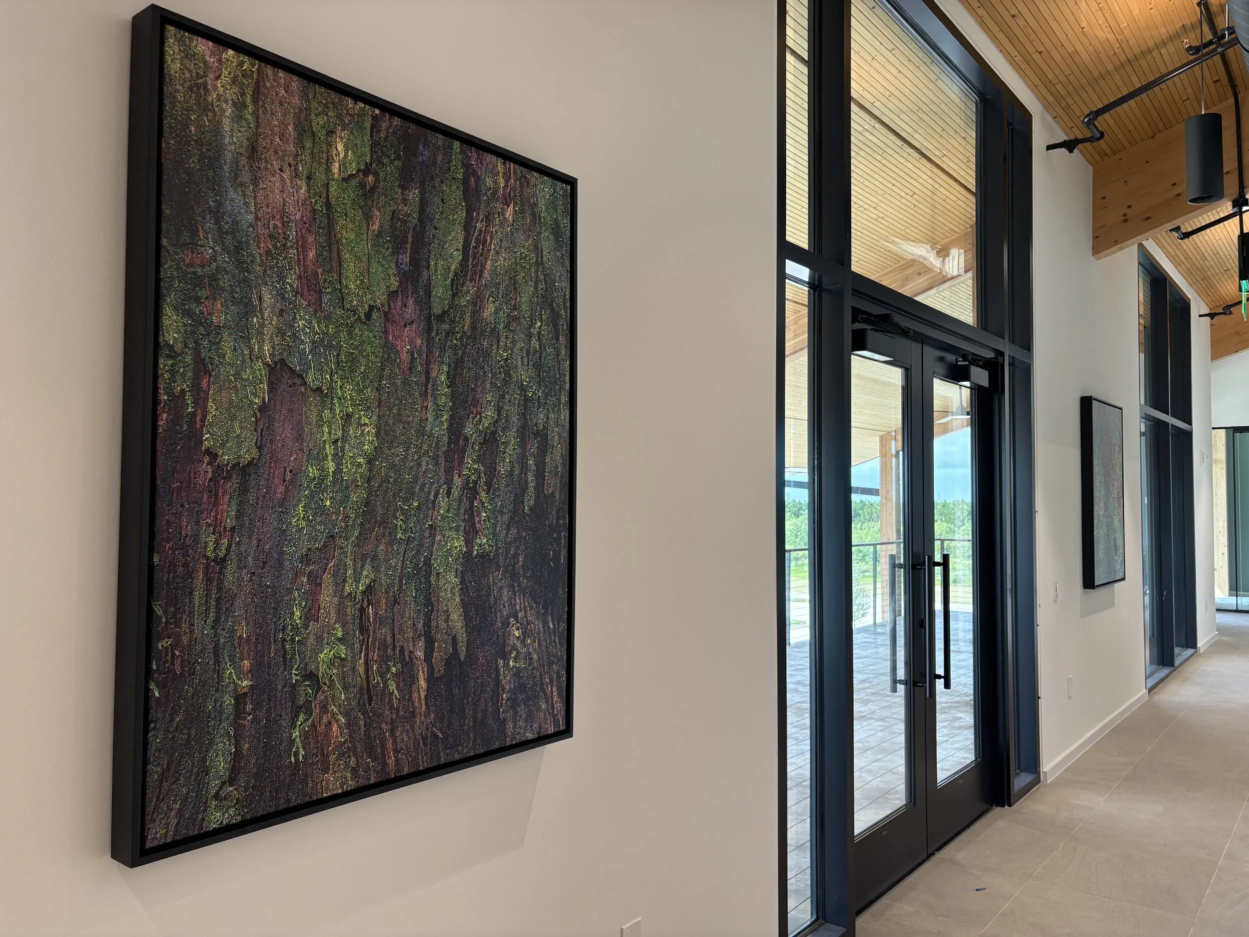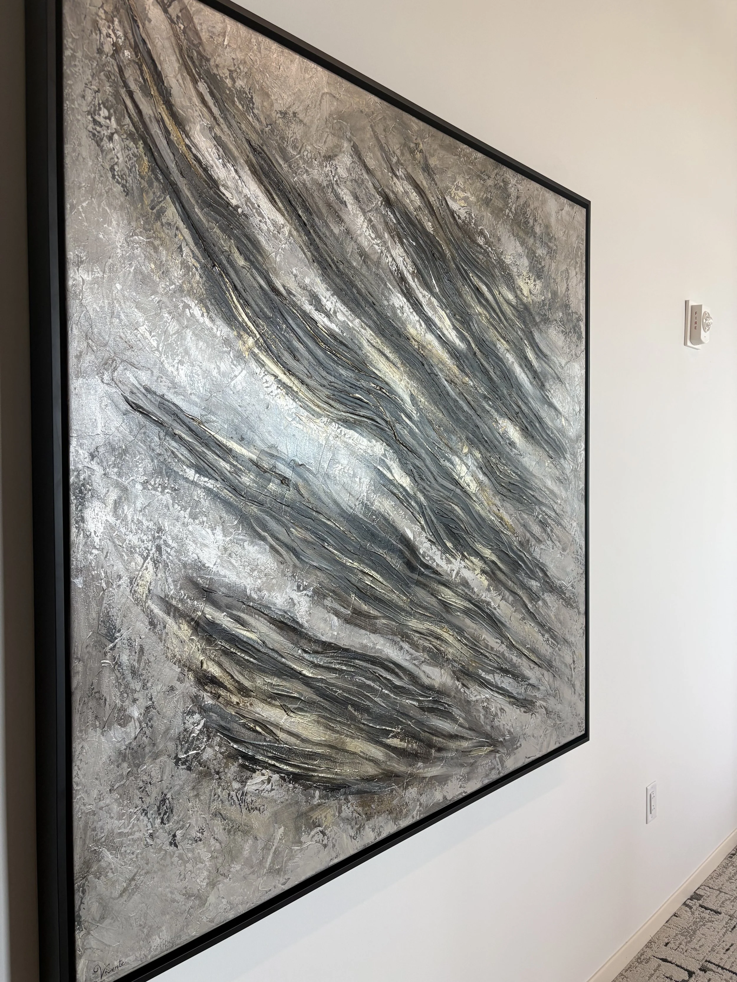 The art program was thoughtfully curated to complement the building’s eco-conscious design and the scenic surroundings of Bridgeland. Featuring organic textures, earthy tones, and natural materials, the collection reinforces the project’s commitment to sustainability while enhancing the building’s modern architectural character.
